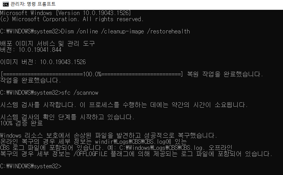 6. 검사 및 복구가 완료되면 아래의 명령어를 입력하고 엔터를 친다.