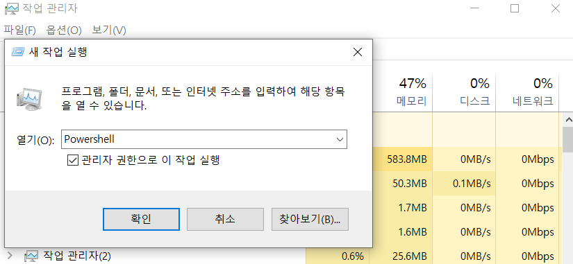 4. 관리자 권한으로 이 작업실행 체크, 확인을 누른다.