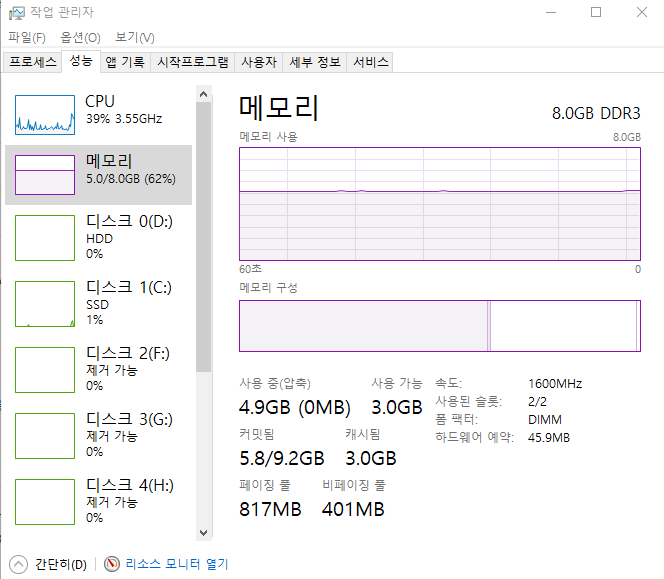 갑자기 아무것도 안했는데 컴퓨터가 버벅거리는 현상을 경험하신 분은 작업관리자를 보시면 메모리가100%로 또는 99%라고 뜨는 것을 볼 수 있습니다. 대부분의 원인은 페이징이 문제로 메모리가 엄청나게 소요됩니다.