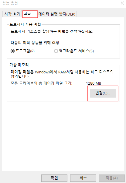 7. 프로그램 선택하고 가상 메모리에 있는 '변경'버튼을 클릭합니다.
