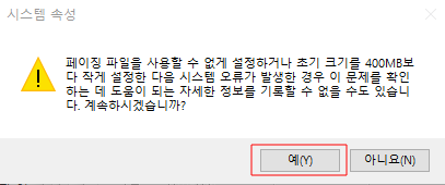 8. 모든 드라이브에 대한 페이징 파일크기 자동관리 '체크해제'