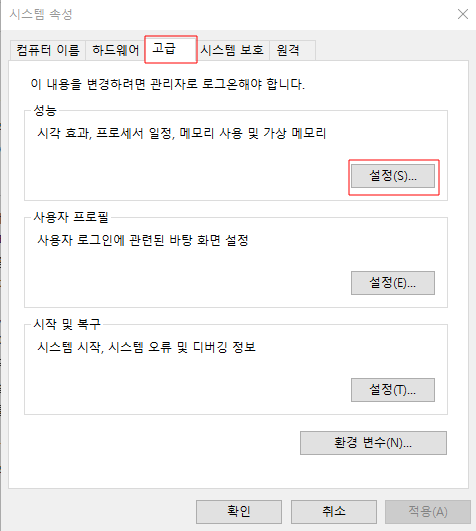5. 첫번째 성능 부분의 '설정'버튼을 클릭합니다.