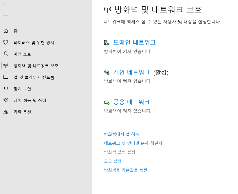 여기에 있는 방화벽 및 네트워크 보호 알림에 켬 부분을 클릭해서 끔 으로 바꾸면 된다.