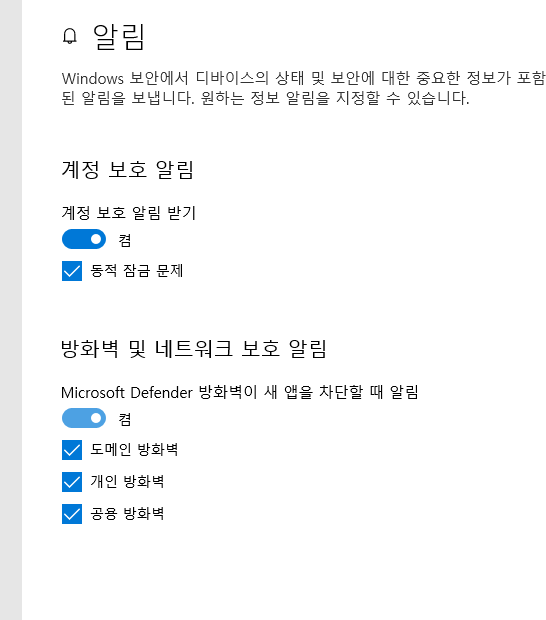 6. 방화벽 및 네트워크 보호 알림에서 Microsoft Defender 방화벽이 새 앱을 차단할 때 알림 이 부분을 끔으로 설정한다.
