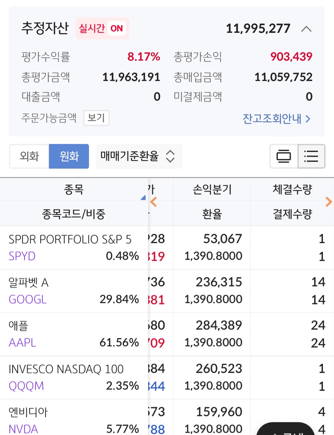 아기계좌로는 현재 구글, 애플, qqqm, 엔비디아,spyd를 보유중이며