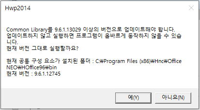 이렇게 최신 버전이 설치되어 있다고 했는데 한글 파일만 열면 경고 메시지가 나올 때