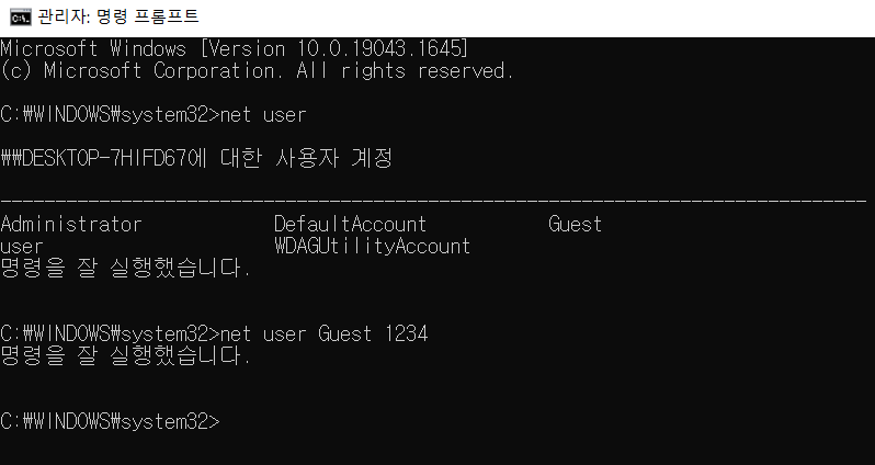 * Guest는 net user를 입력하면 붉은색 박스 가장 오른쪽 계정 명을 확인할 수 있음.